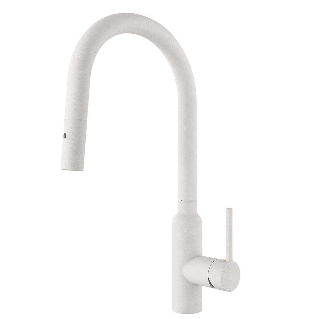 DESCRIPTION Premium Granite White pull-out kitchen faucet with a modern angled spout design, crafted for both style and functionality. The flexible pull-out hose and 360° swivel spout provide precise water control, making daily cleaning effortless and efficient. Built with internationally recognised components to ensure smooth performance and long-term reliability.