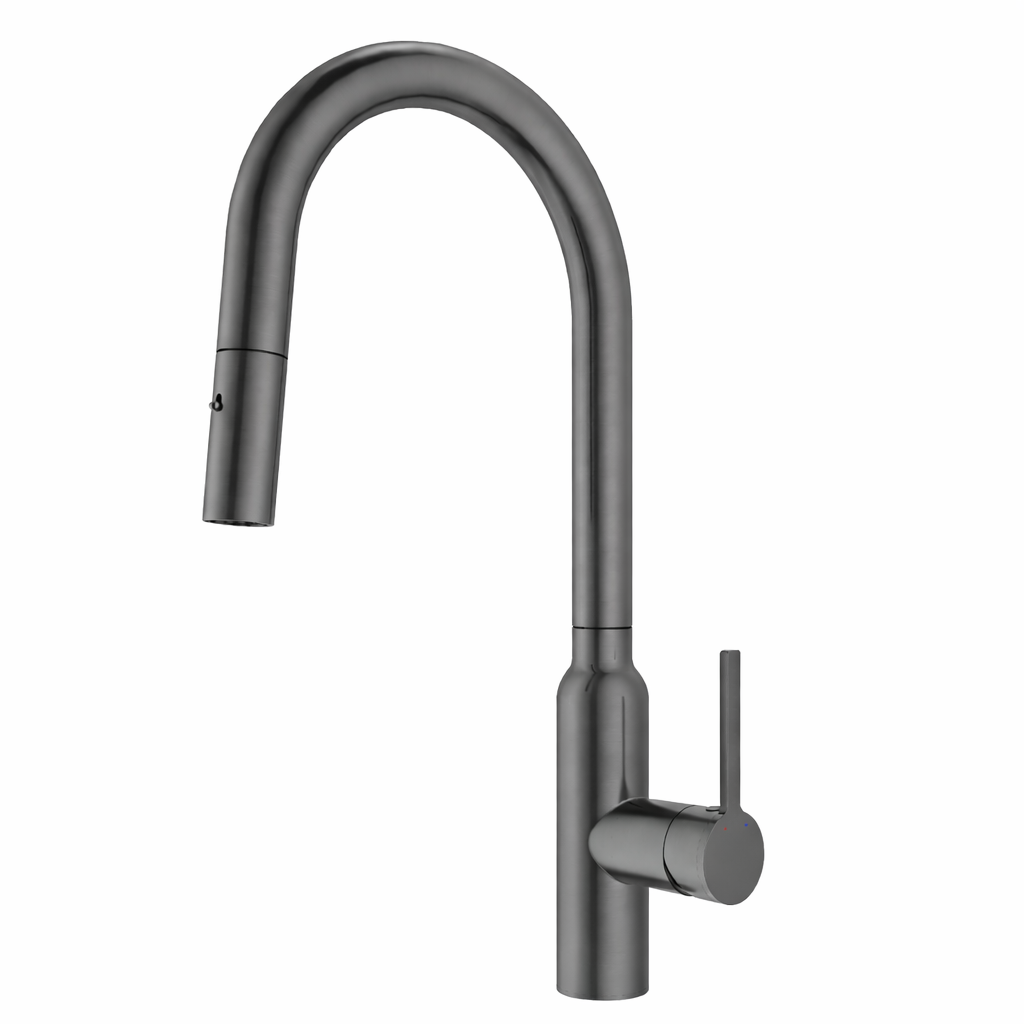 DESCRIPTION Premium Gun Metal pull-out kitchen faucet with a modern angled spout design, crafted for both style and functionality. The flexible pull-out hose and 360° swivel spout provide precise water control, making daily cleaning effortless and efficient. Built with internationally recognised components to ensure smooth performance and long-term reliability.